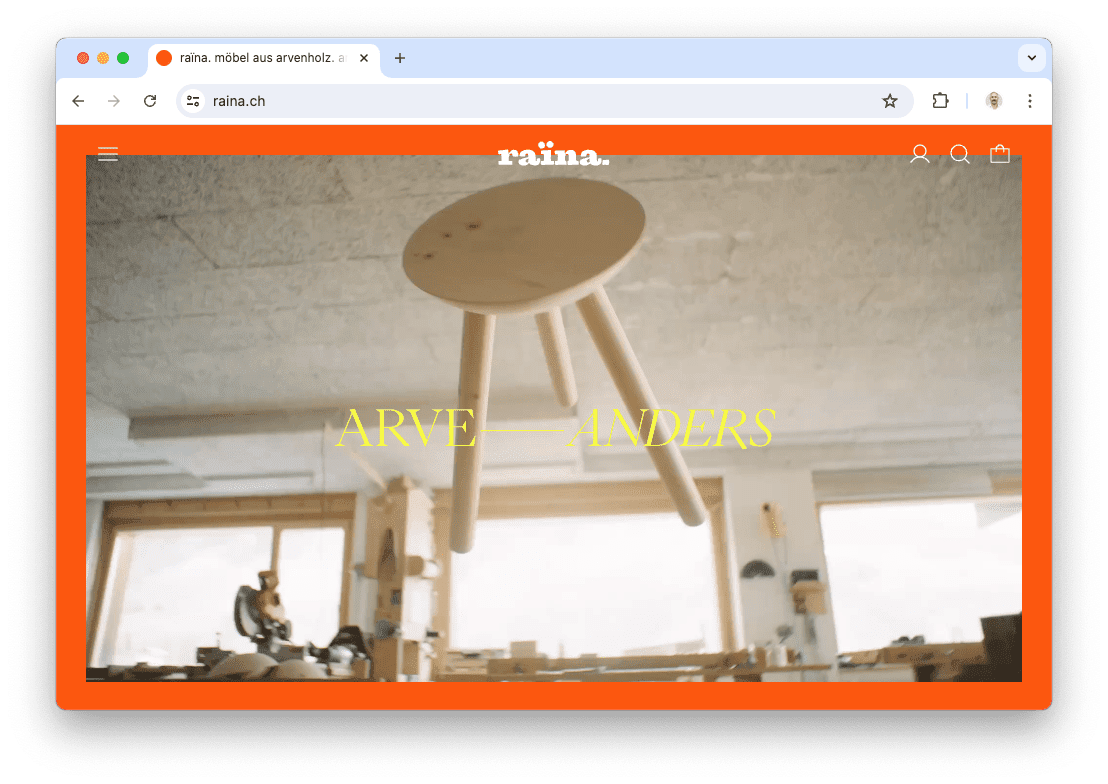 Eine Website macht raïna und ihre Möbel erlebbar. Mit tiefenentspannten Filmportraits und Produktaufnahmen im Umfeld wird der Onlineauftritt zu einem grosszügigen Showroom. Vom Kauf sind die User:innen jeweils nur einen Klick entfernt.
