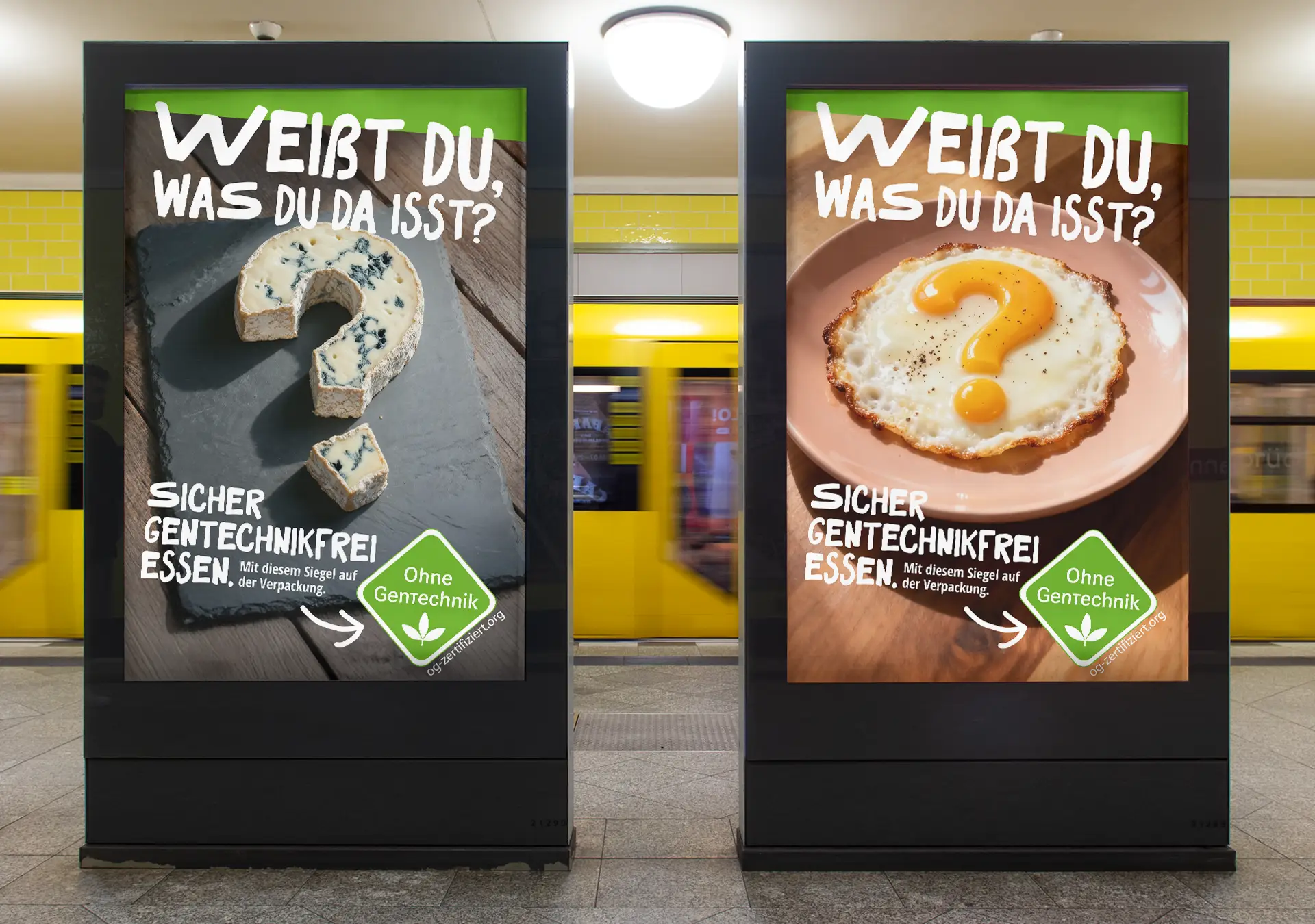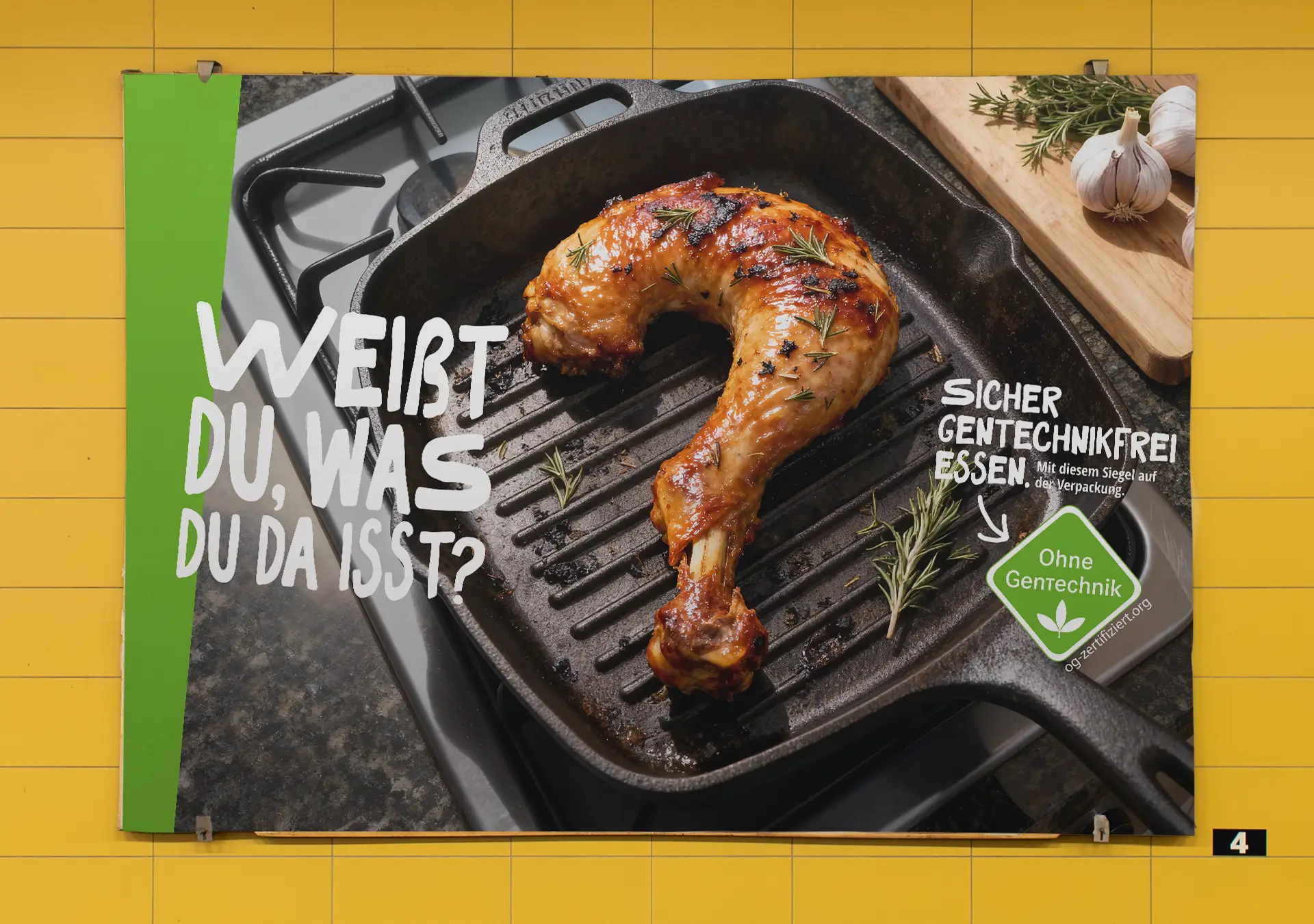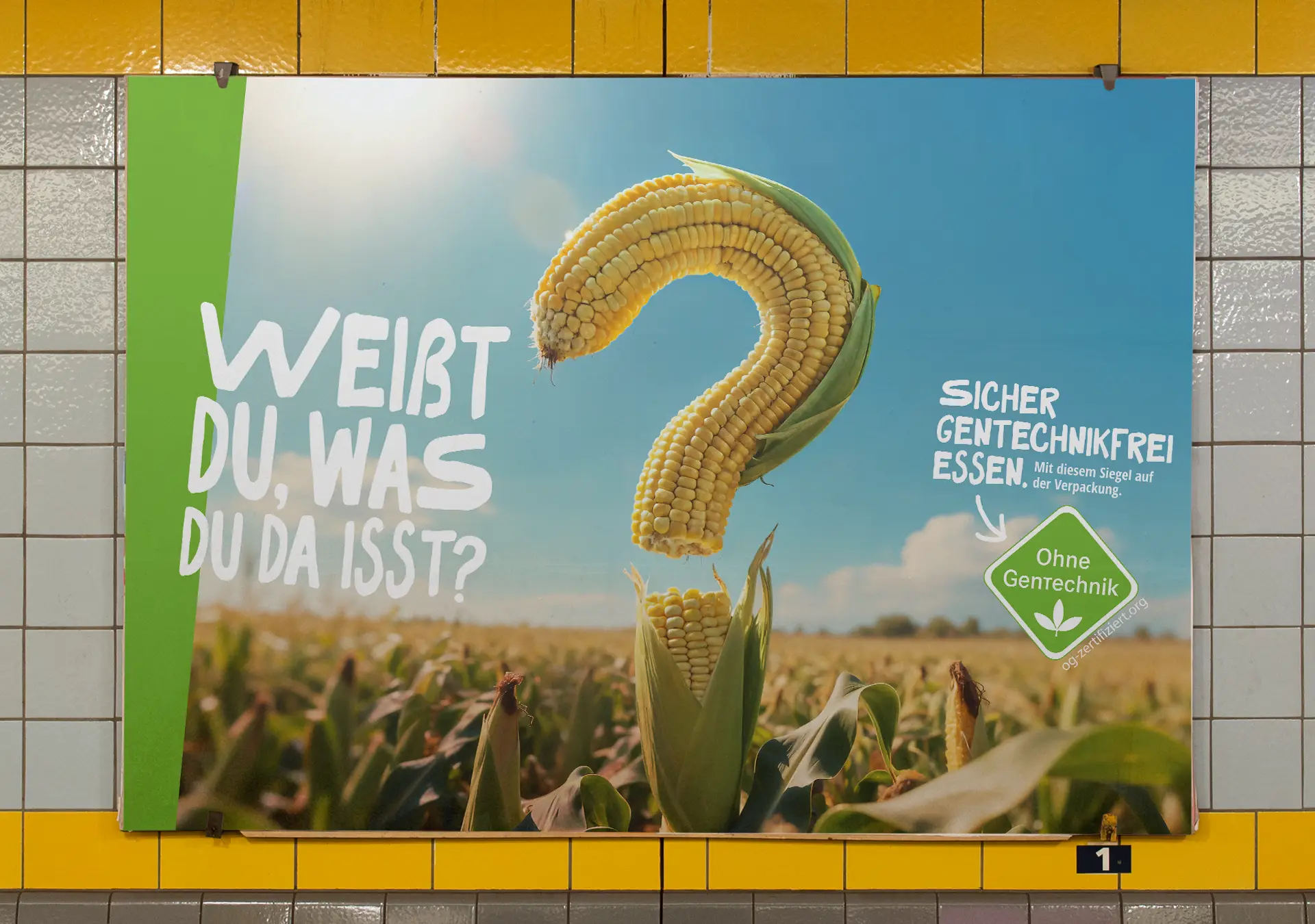 NORMAL setzt Lebensmittel als Fragezeichen in Szene. Der auflösende Satz «Sicher ohne Gentechnik.» schafft Vertrauen und steigert die Relevanz des Siegels.