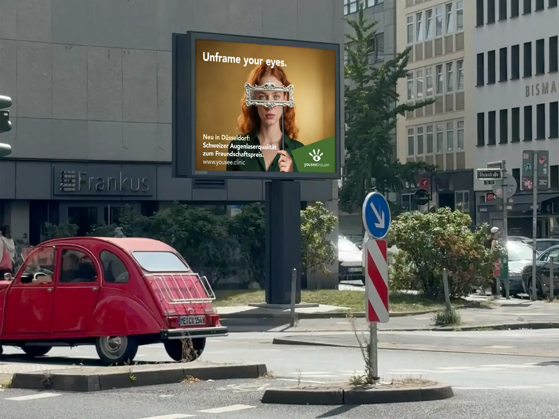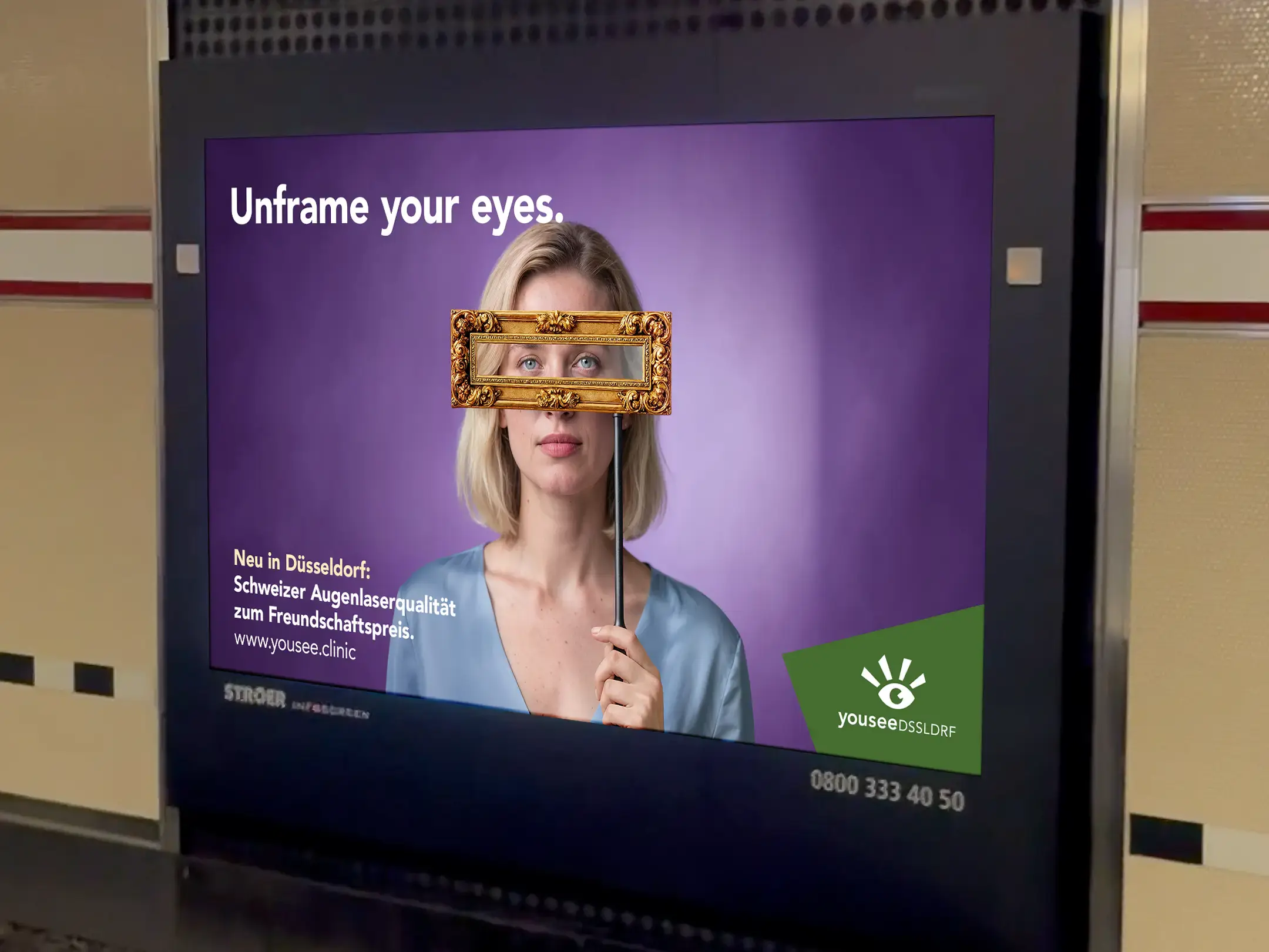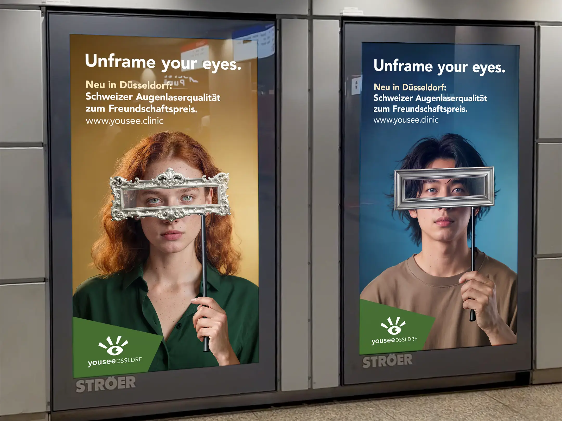Die Kampagne zeigt Portraits von Menschen, die einen sperrigen Bilderrahmen vor ihren Augen tragen. Der Kampagnensatz «Unframe your Eyes» löst die Bildidee auf. Da Düsseldorf zu den führenden Kunststädten in Deutschland zählt, passt die Bildidee auch ideal ins Stadtbild.